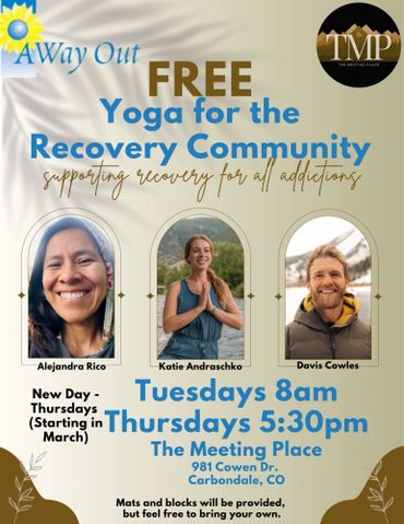 We provide our space for 12 step recovery meetings such as AA, NA, OA, SA, yoga, meditation, and mindfulness groups. We also offer childcare, yoga, and wellness programming. TMP is located in Carbondale, CO serving the Roaring Fork Valley from Aspen and Basalt to Glenwood Springs, Newcastle, Rifle, and the Parachute Corridor. Virtual meetings offered for individuals outside of our service area.